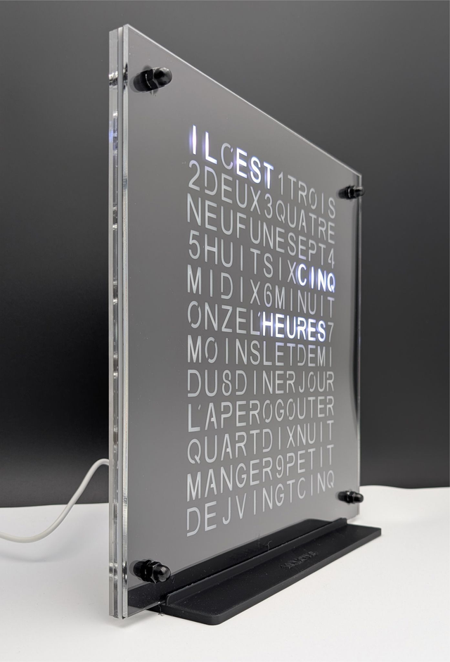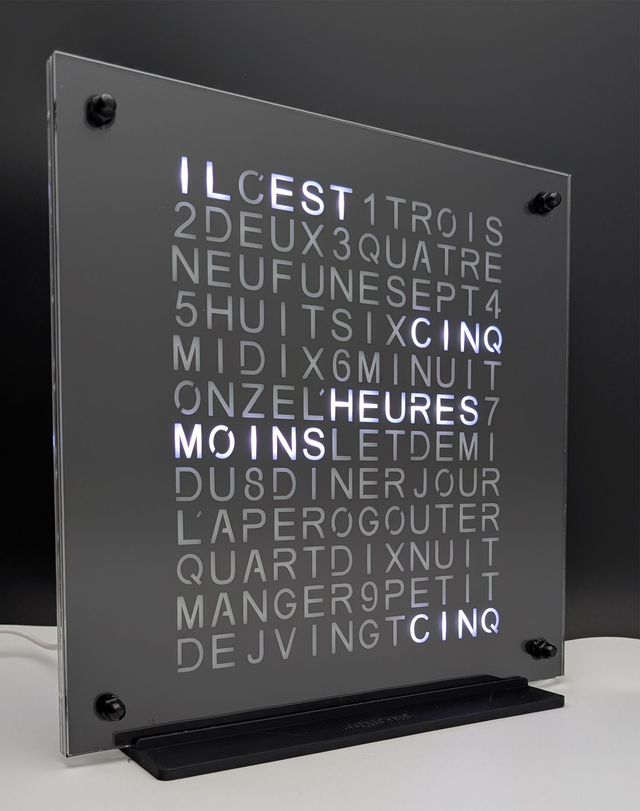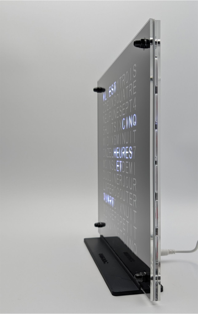 Une horloge à poser de marque LUMOTIC, réalisée en Plexiglass sur support.